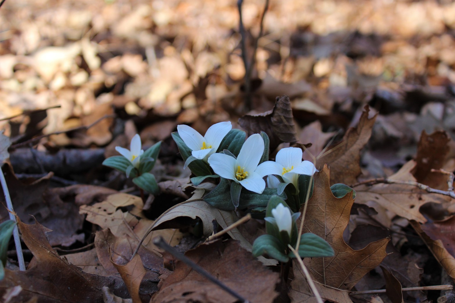 Amongst the dry leaves first appeared one, then three, then ten, then perhaps a couple hundred tiny white flowers! We were exuberant! People scattered and hunched down to get a close look at the tiny beauties. Some trilliums looked like they had just emerged while others had fully opened, basking in the gentle warmth of the early April sun. Along with the snow trillium we found the early shoots of sweet cicely (Osmorhiza sp.), spring beauty (Claytonia virginica), and Canada meadow garlic (Allium canadense). It was amazing to see just how early the trilliums were compared to all other herbaceous species.