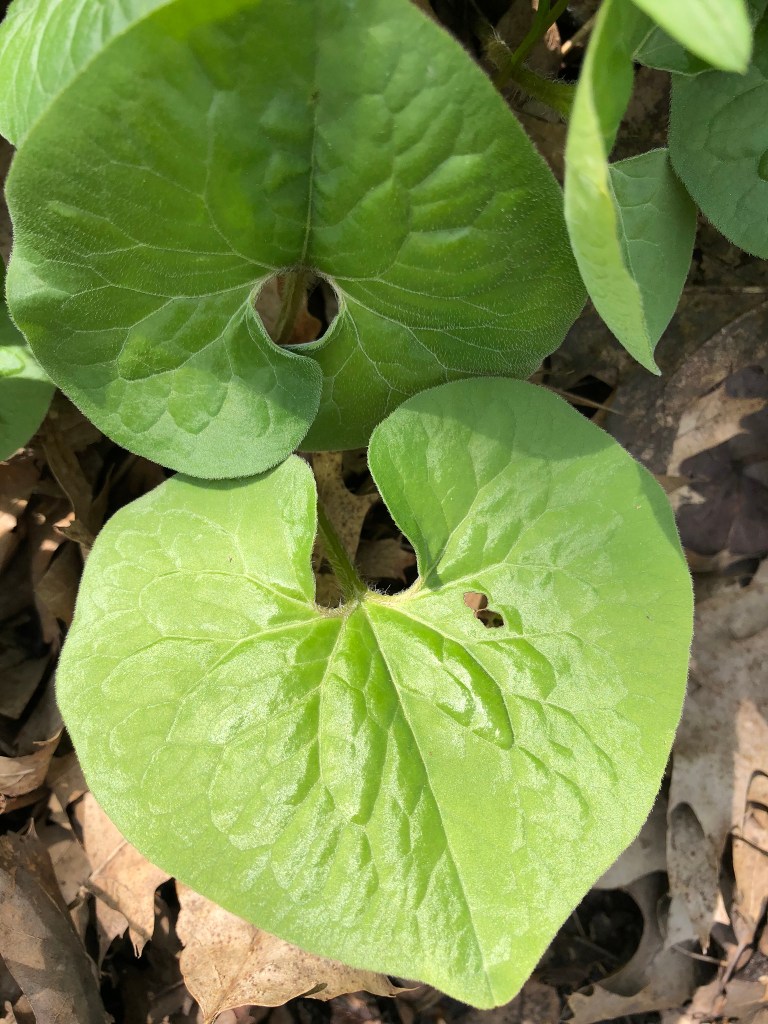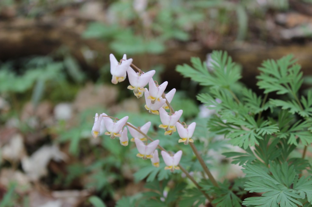 The trail dropped us into a broad ravine with a stream running through it. A diverse array of spring flora carpeted the ground in most places. The group got to see Large-flowered Bellwort (Uvularia grandiflora), Dutchman’s Breeches (Dicentra cucullaria), Virginia Waterleaf (Hydrophyllum virginianum), Canada Wild Ginger (Asarum canadense), False Rue-anemone (Enemion biternatum), Narrowleaf Wild Leek (Allium burdickii), and Spring Beauty (Claytonia virginica), among others.