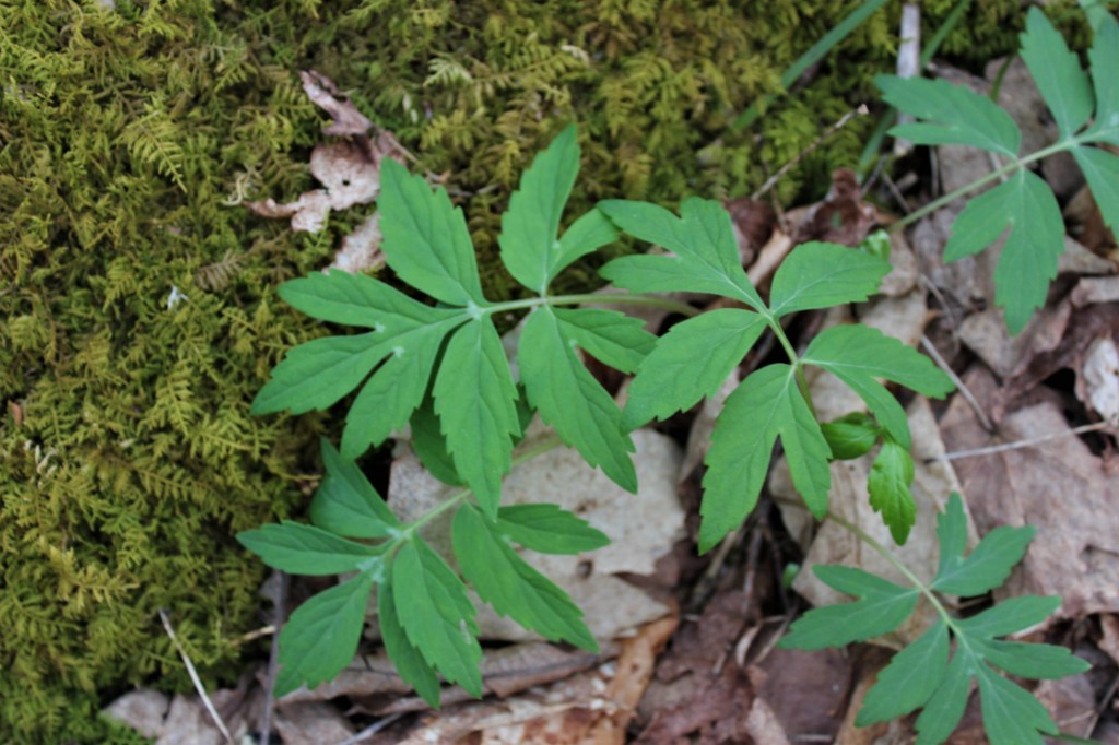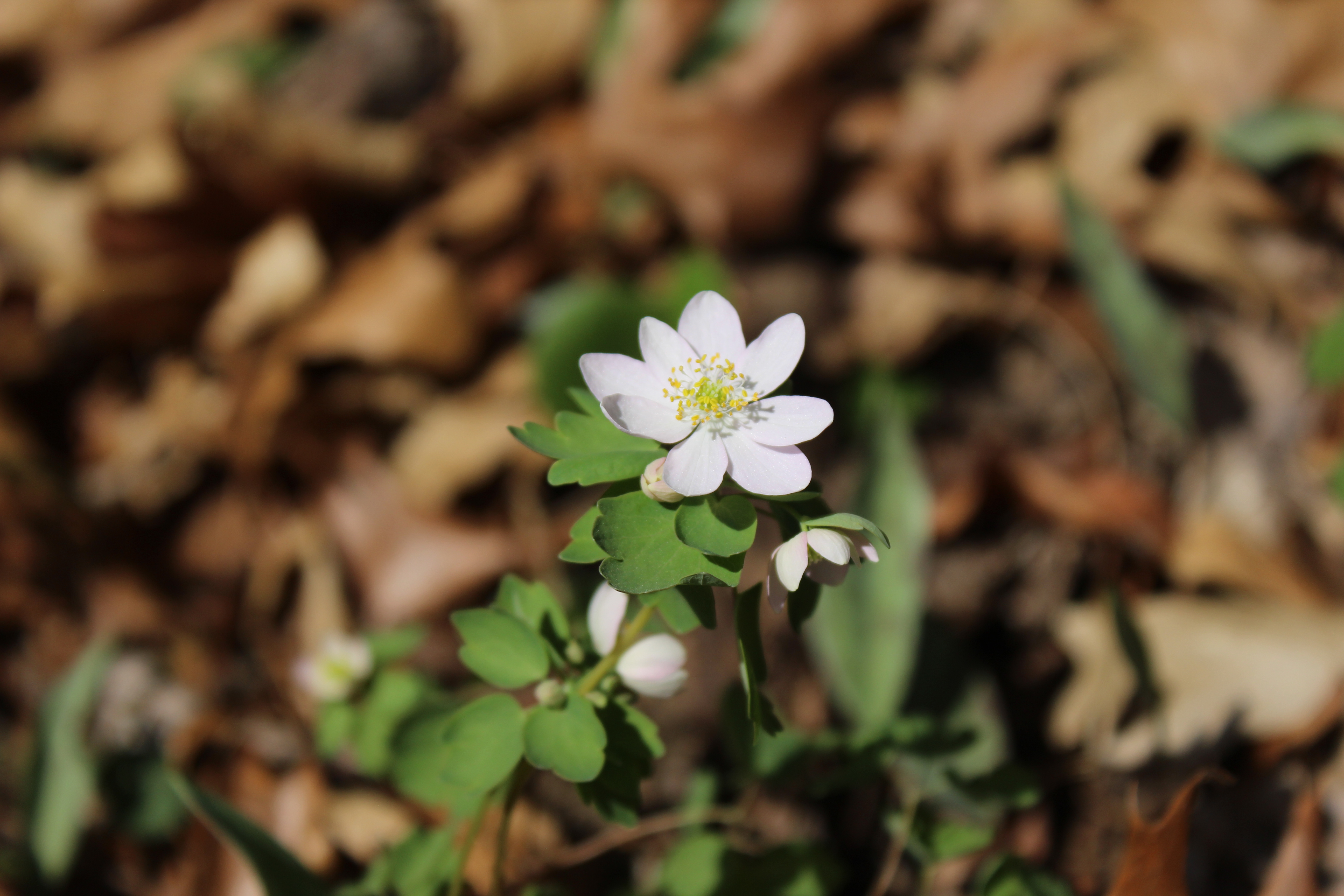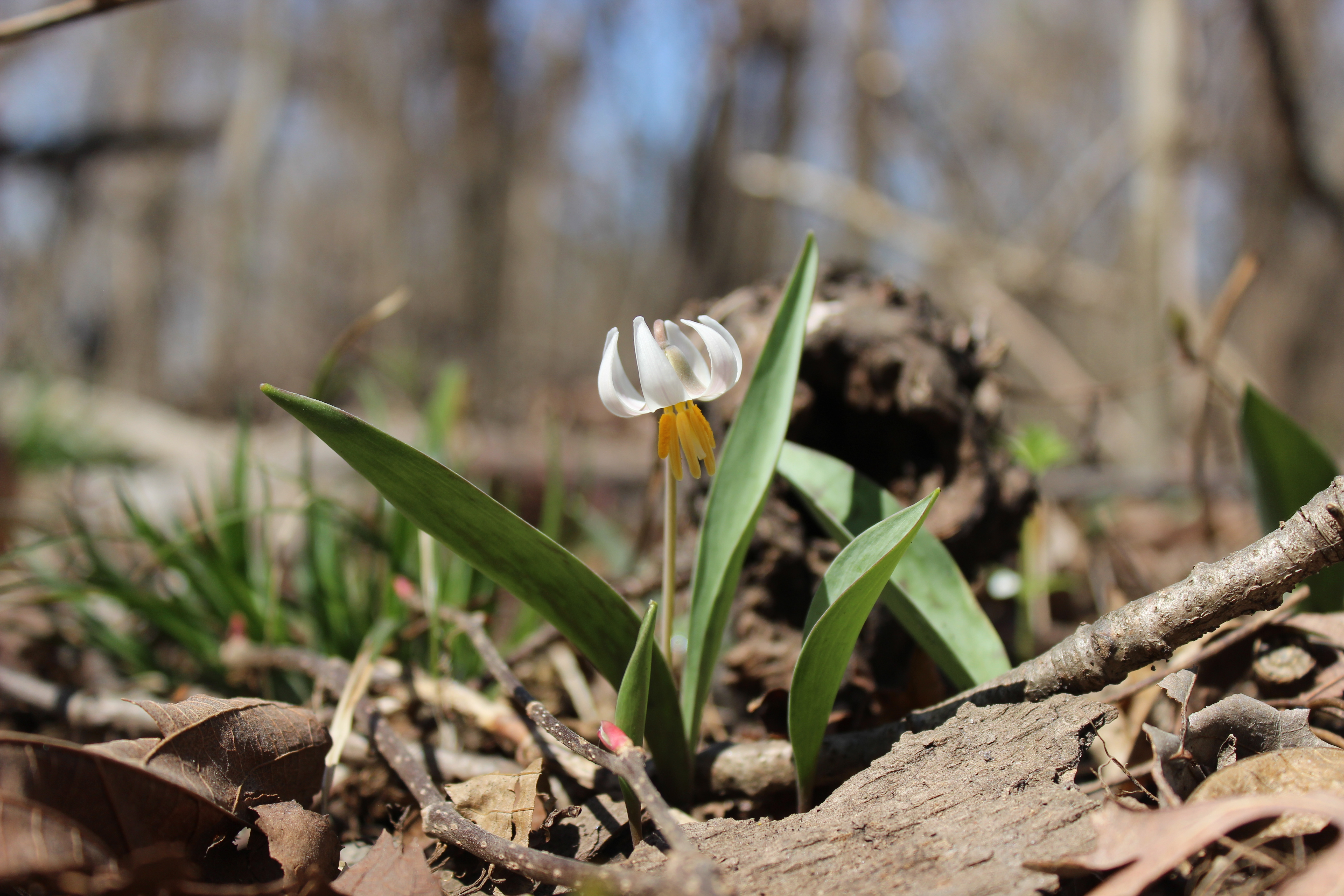Amongst the dry leaves first appeared one, then three, then ten, then perhaps a couple hundred tiny white flowers! We were exuberant! People scattered and hunched down to get a close look at the tiny beauties. Some trilliums looked like they had just emerged while others had fully opened, basking in the gentle warmth of the early April sun. Along with the snow trillium we found the early shoots of sweet cicely (Osmorhiza sp.), spring beauty (Claytonia virginica), and Canada meadow garlic (Allium canadense). It was amazing to see just how early the trilliums were compared to all other herbaceous species.