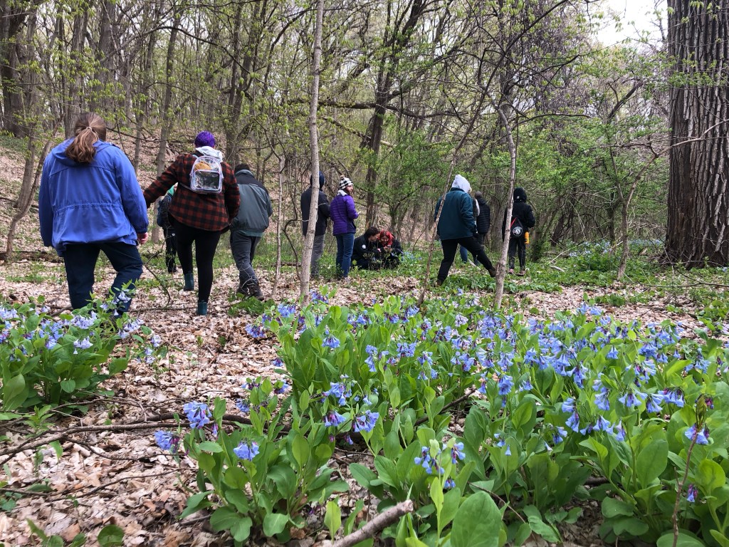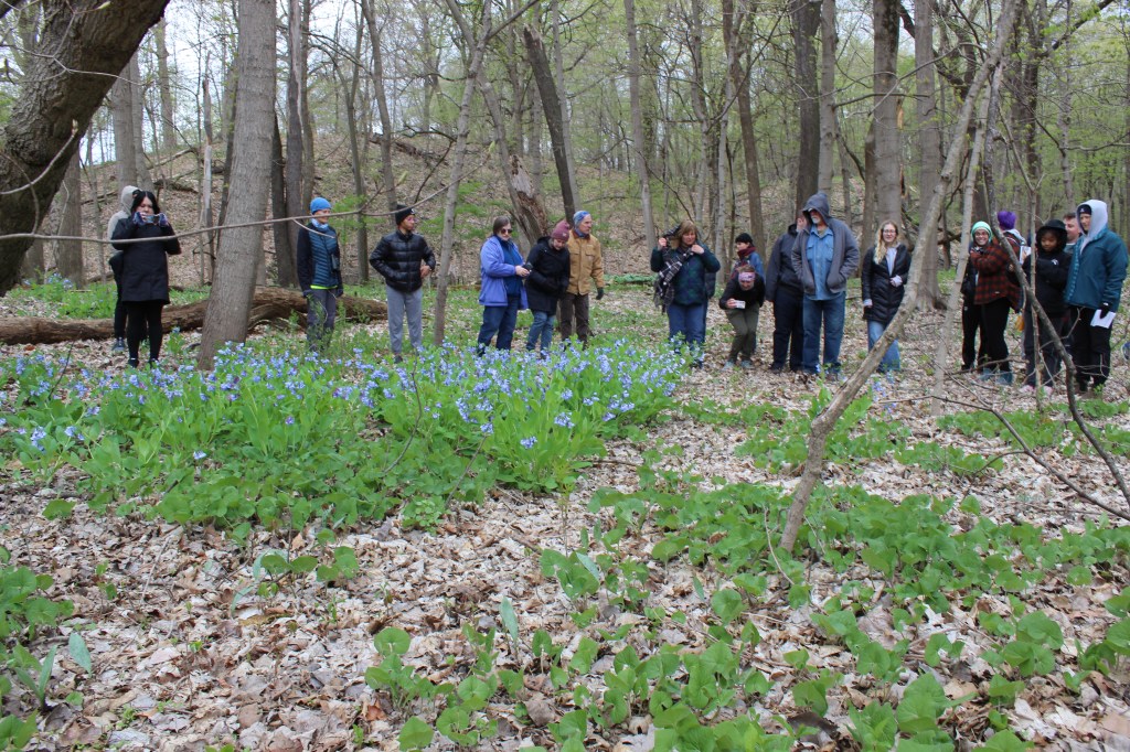 We continued to follow the trail through the rich woodland. Little did anyone know, however, that we were almost at the grand finale! Our final stop was in the southeast corner of the preserve along the stream there. Upon reaching the destination, we were greeted by a swath of bright blue! People were quickly drawn towards the patches of Bluebells (Mertensia virginica) growing on the stream terrace.