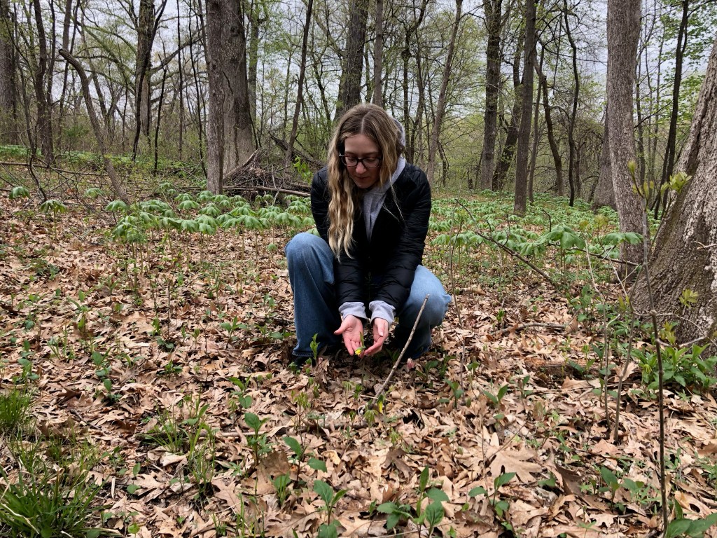 Upon entering the woodlands, we were immediately greeted by an uplifting display of Redbud (Cercis canadensis) flowers! They lined the sides of the path, almost creating a purple tunnel for us to walk through. Carpets of green and white emerging from the recently burned woodland floor redirected our eyes towards the ground. I introduced the group to several of the spring ephemerals there, including Cut-leaved Toothwort (Cardamine concatenata), Rue Anemone (Thalictrum thalictroides), Prairie Trillium (Trillium recurvatum), and White Trout Lily (Erythronium albidum).