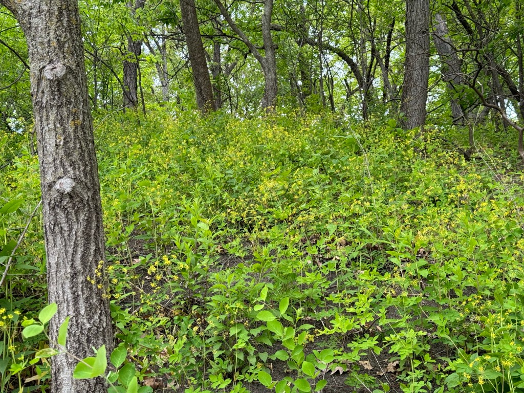 The other day, I paid a visit to one of my favorite natural areas in the Quad Cities: Black Hawk State Historic Site. In particular, I chose to explore the dry, rocky bluff along the Rock River to see what spring flora I could find. Making my way along on the footpath, I soon came upon an area where I helped clear brush this past winter. A dense patch of European buckthorn and rough leaf dogwood had been cleared from a steep south-facing slope where a few stems of remnant prairie species had been spotted the year prior. To my surprise, I was met with lush green and yellow where the thicket and minimal herbaceous cover had been. Yellow Pimpernel (Taenidia integerrima), which, as of last year, grew only in a narrow strip along the footpath where sunlight was adequate, now blanketed the slope! Little did I know that hundreds of plants were lying in wait beneath the brush.