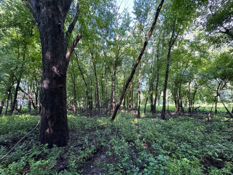 A typical wet floodplain forest in the Upper Mississippi bottomland characterized by a canopy of silver maple and an herbaceous layer composed of whitegrass (Leersia virginica), clearweed (Pilea pumila), and little else. Photo by Grant Fessler.