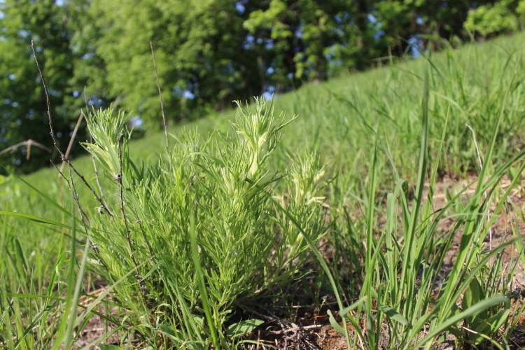 Dry loess hill prairie in early summer with leadplant, flowering spurge, little blue stem, dogwood. Rock Island Co., IL.