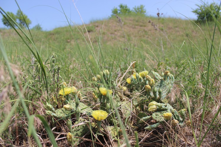 Dry sand savanna with black oak, prickly pear cactus, clustered poppy mallow, and rough blazing star. Whiteside Co., IL.